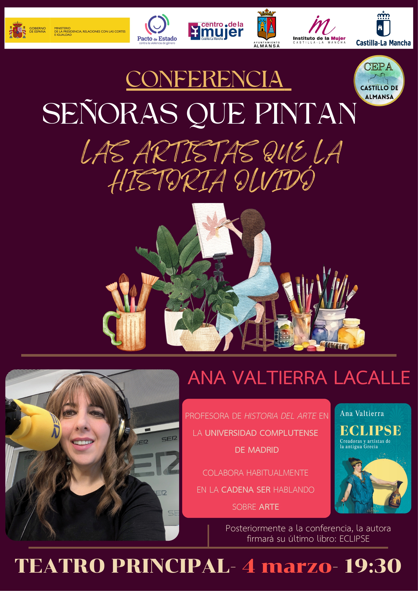 Tercero anunció que el próximo 4 de marzo, a las 19:30 horas, el Teatro Principal acogerá la conferencia de Ana Valtierra Lacalle, profesora de Historia del Arte en la Universidad Complutense de Madrid y colaboradora habitual en la Cadena SER. La entrada será gratuita hasta completar aforo.